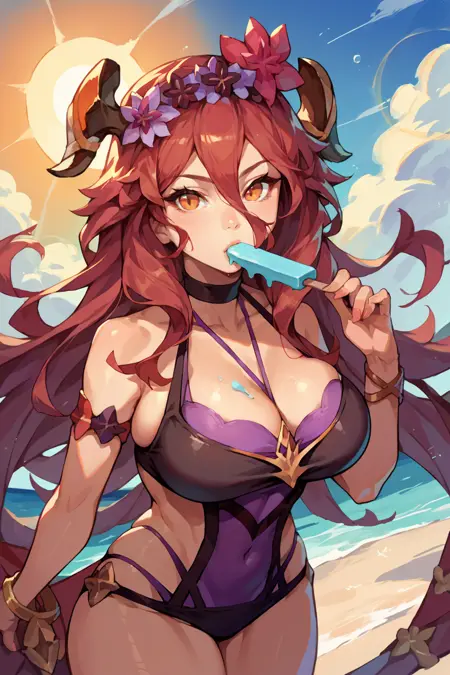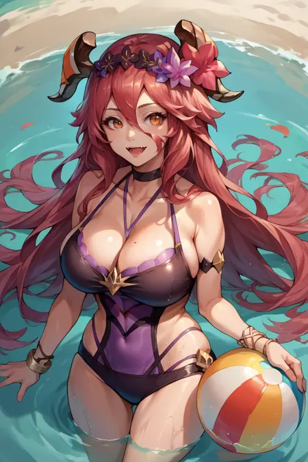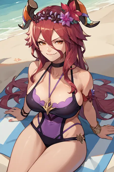 여름 복장을 원하면 "sumMym, 빨간 머리, 뿔, 초커, 머리 꽃, 머리 장식, 원피스 수영복, 팔찌"를 추가하세요.