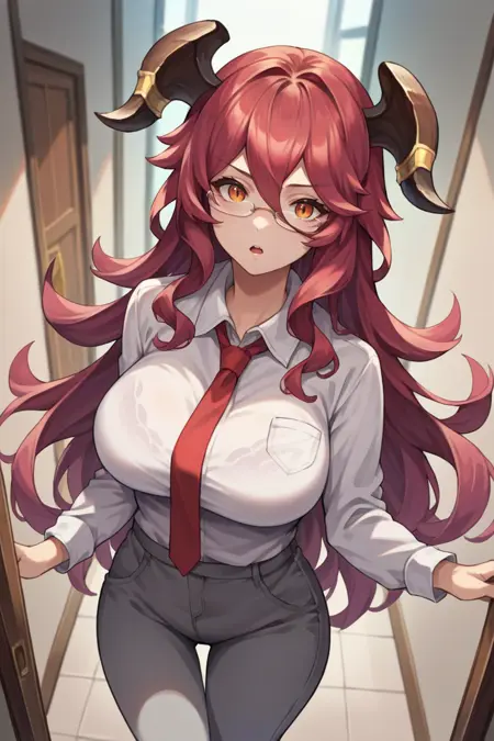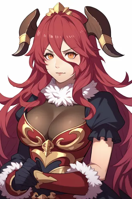 기본 외모를 원하면 "defMym, 빨간 머리, 뿔, 갑옷, 바디스톡킹, 풍성한 소매, 드레스, 검은 장갑, 모피 트림, 허벅지 긴 양말"을 추가하세요.