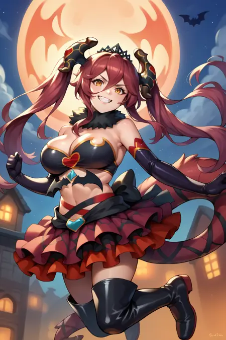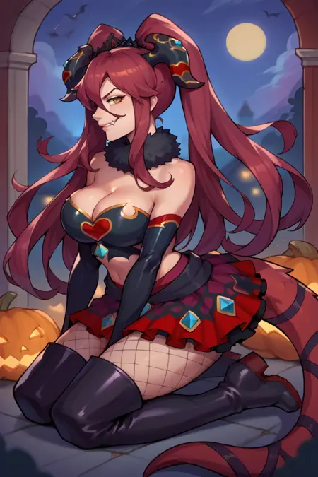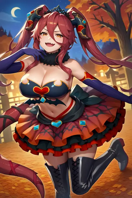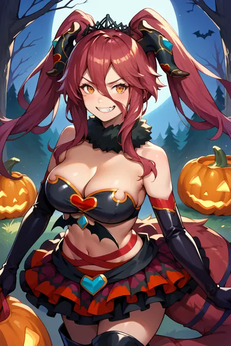 할로윈 복장을 원하면 "haloMym, 빨간 머리, 티아라, 뿔, 모피 칼라, 할로윈 복장, 더블테일, 가슴 노출, 허리 노출, 팔꿈치 장갑, 빨간 치마, 허벅지 부츠, 꼬리"를 추가하세요.