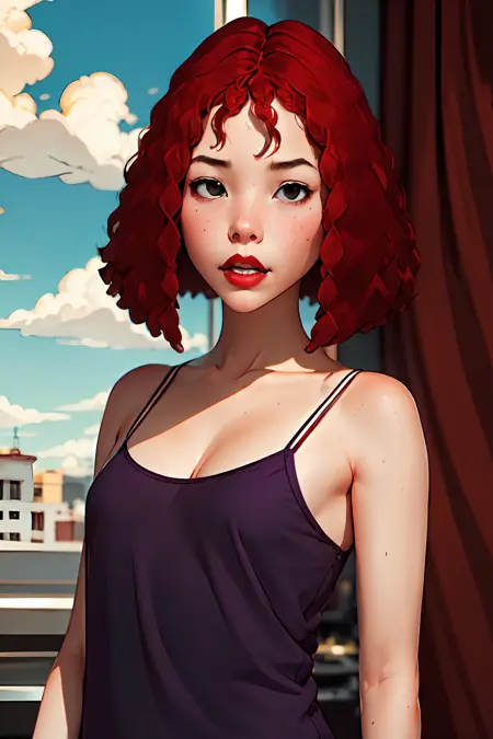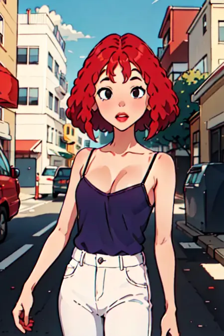 유용한 태그: 캐미솔에 착용한 parody, purple shirt, spaghetti strip, black eyes, red hair, white pants