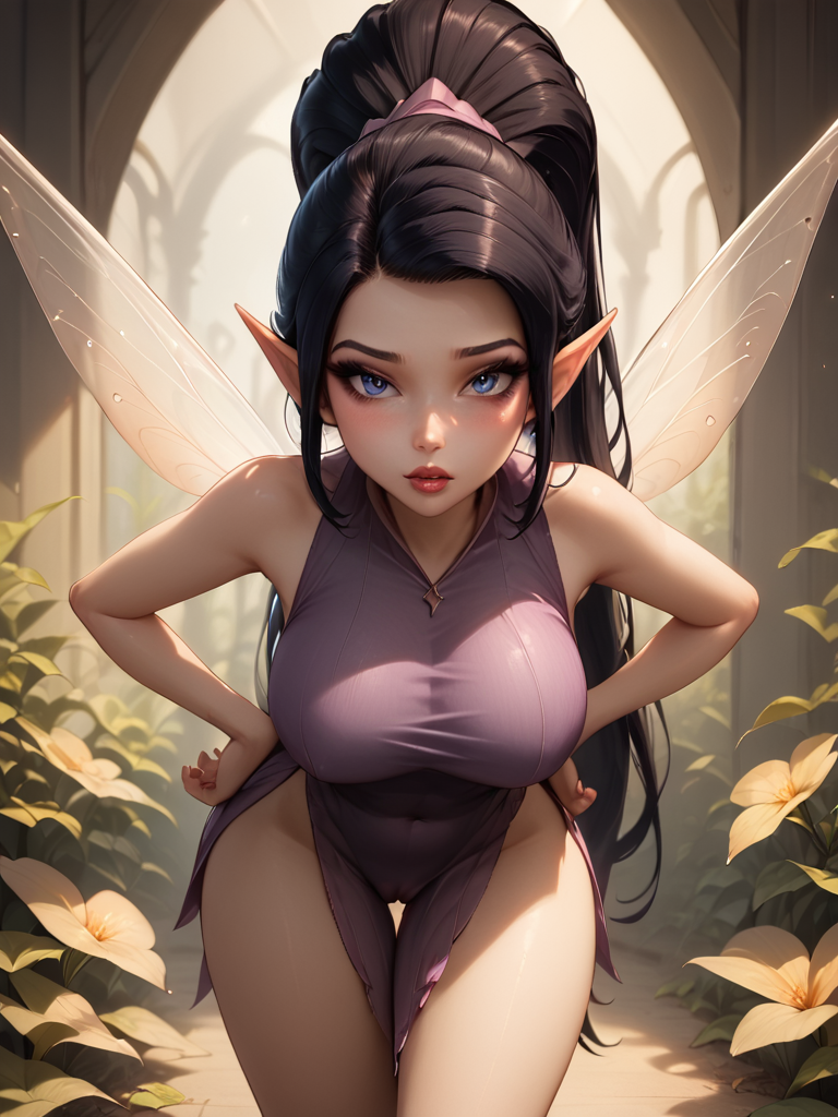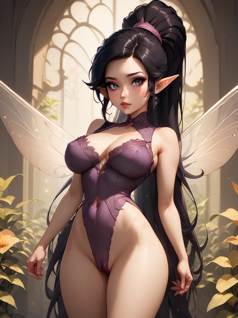 v1d14, long hair, 1girl, solo, ponytail, black hair, wings, fairy, pointy ears, fairy wings, dress, looking at viewer, sleeveless, lips, purple dress, makeup