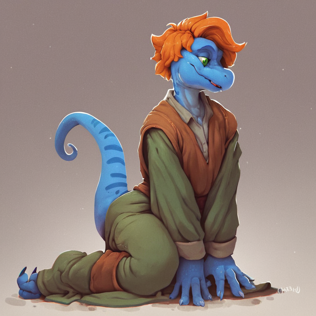 SDXL LoRA trained with Civit-AI trainer for Pony V6/Pony merges, trained on the style of Chikiota, a furry artist who works with anthros from nintendo franchises such as pokemon and various scaly types. They have a colorful style and tend to draw scalies with human genitalia / foreskin