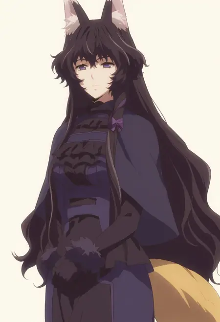 nureha, dress, black hair, fox ears, fox tail, fur trim, purple eyes