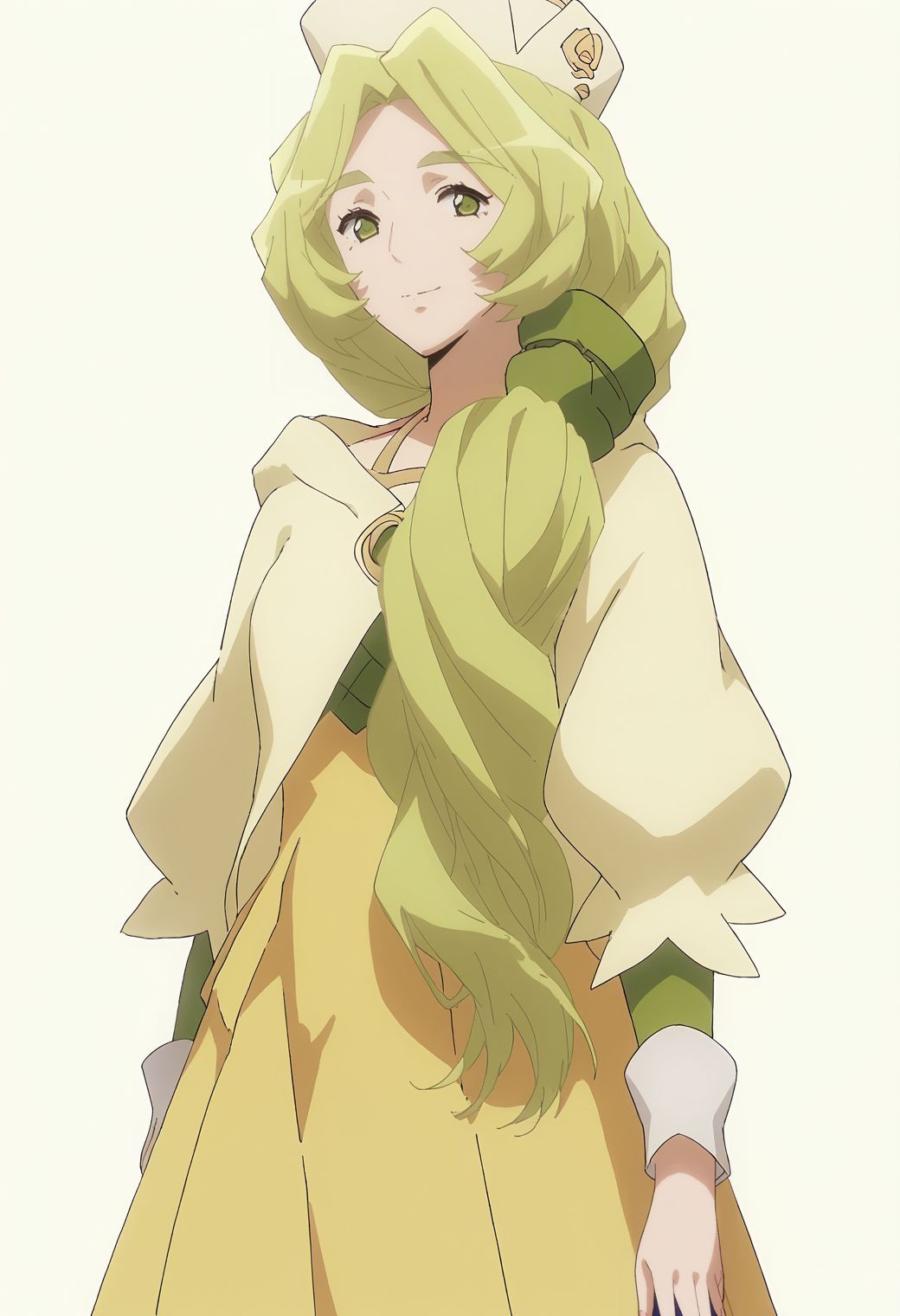 dariella, hair over shoulder, capelet, long skirt, hat, green hair
