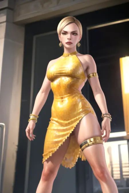 AmberBailey, 1girl, solo, short hair, blonde hair, yellow dress, jewelry, earrings, bracelet, makeup, thigh strap, short dress