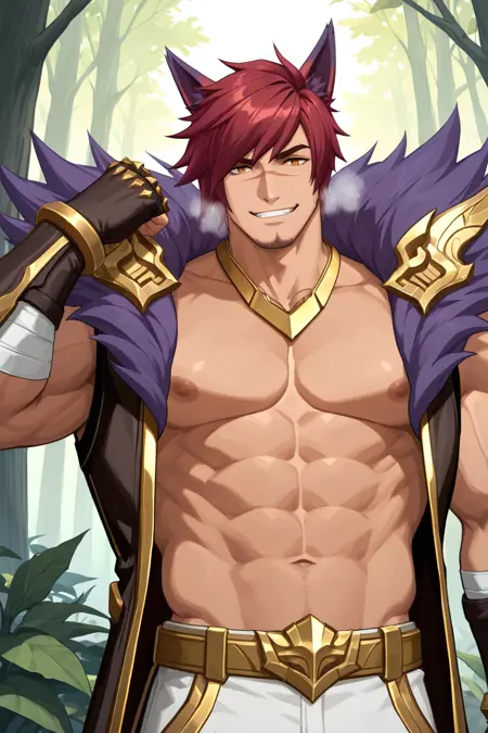 [塞特,敞开的外套,裸露的衣物,绷带,露指手套,护腕,珠宝,白色长裤,紫色皮毛镶边,金色腰带]