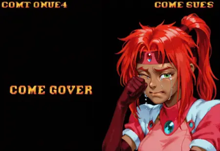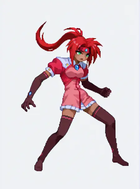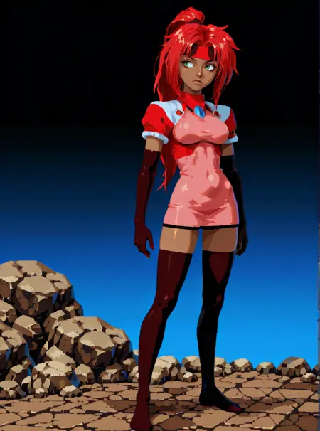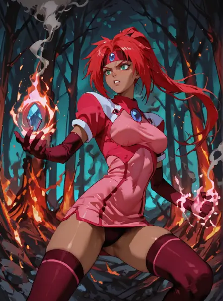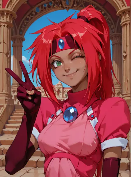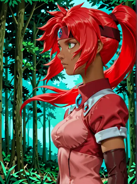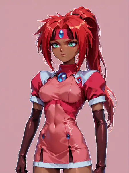 ShaylaEl, 1girl, dark skinned girl, solo, red hair, Ponytail, anime hair, headband with a blue stone in the middle, green eyes, red and pink outfit, elbow gloves