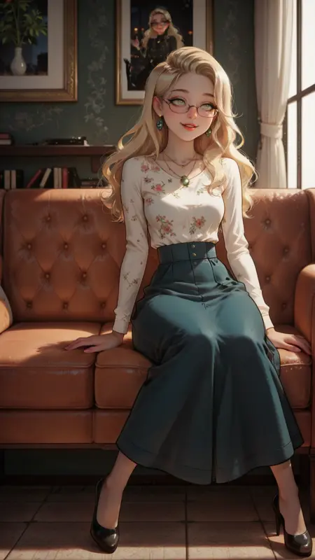 인간 형태: MayberryHuman, 1girl, 금발 머리, 초록 눈, 긴 머리, 안경, 주얼리, 귀걸이, 흰 셔츠, 녹색 치마, 긴 치마, 목걸이, 꽃 무늬