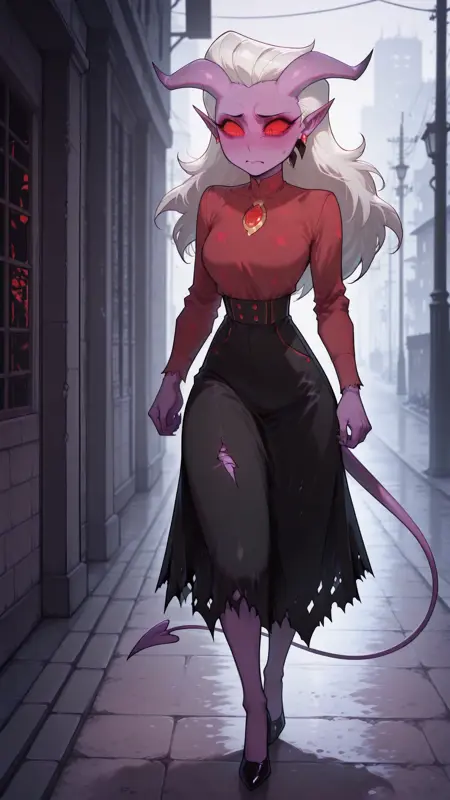 악마 형태: M4yb3rryD3m0n, 1girl, 악마 소녀, 색깔 있는 피부, 보라색 피부, 흰 긴 머리, 뾰족한 귀, 빨간 눈, 색깔 있는 공막, 뿔, 악마 꼬리, 주얼리, 귀걸이, 브로치, 빨간 셔츠, 긴 소매, 검은 치마, 찢어진 옷, 검은 하이힐