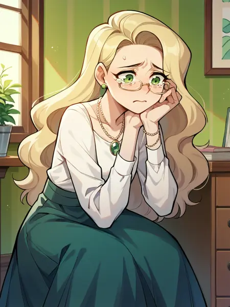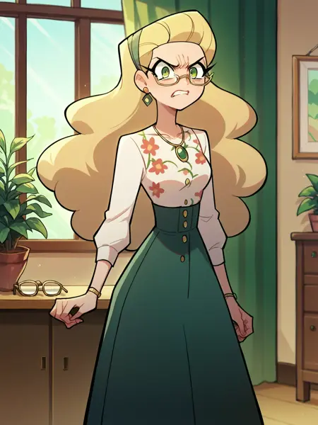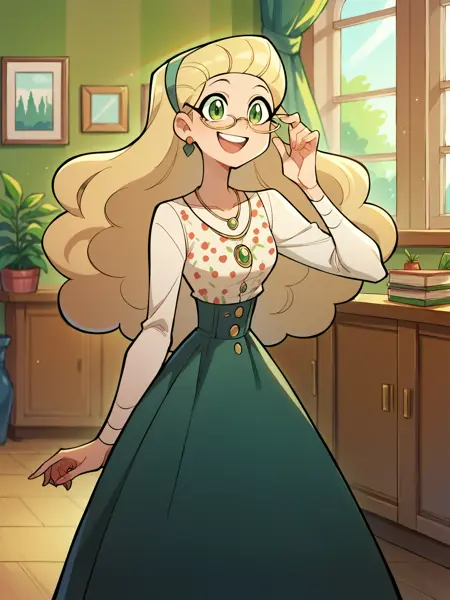 Human Form: MayberryHuman, 1girl, blonde hair, green eyes, long hair, glasses, jewelry, earrings, white shirt, green skirt, long skirt, necklace, floral print