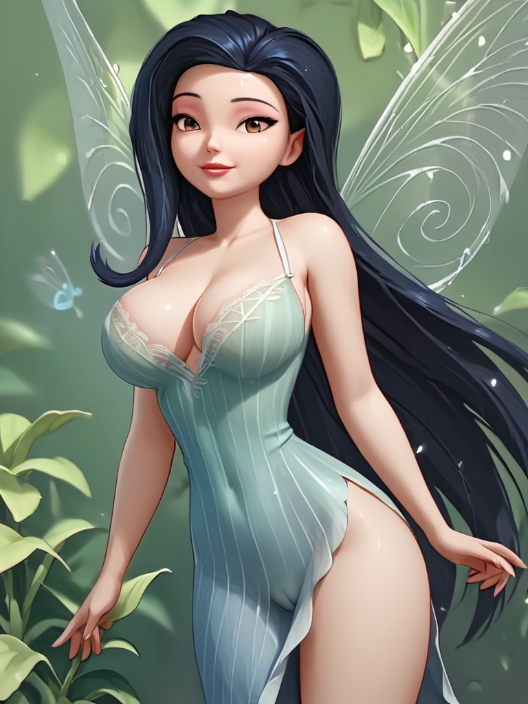 s1lv3rm1st, long hair, dress, 1girl, solo, black hair, wings, fairy, fairy wings, bare shoulders, smile, black eyes, lips, brown eyes, blue hair, very long hair, looking away, strapless
