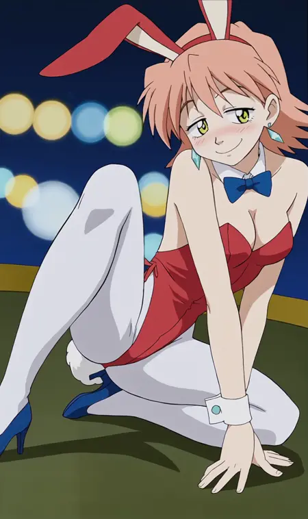 Rabbit Outfit-'red leotard, rabbit ears hairband, crystal earrings, blue bowtie, wrist cuffs, white tights, rabbit tail, blue heels,'