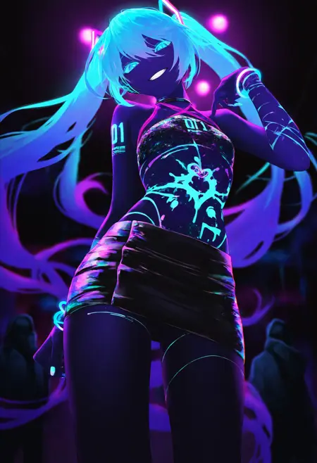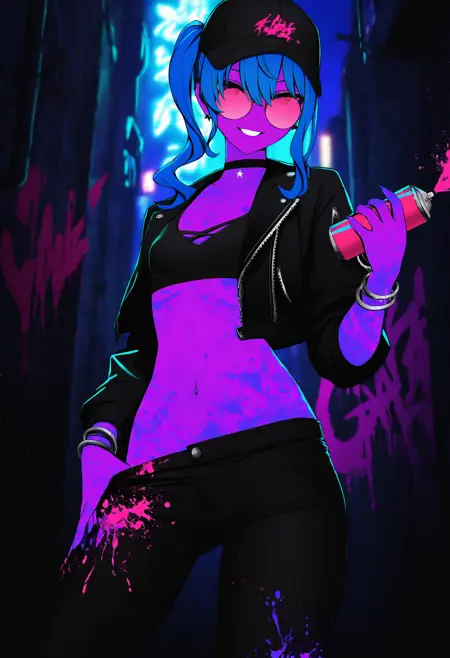 This LoRA is intended to apply an ultraviolet luminiscent style to characters, with bodypaint and paint splatters.