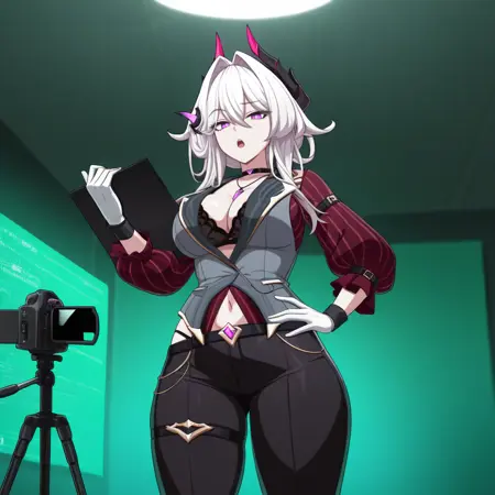 Thelema, Thel_Grv, purple eyes, medium hair, white hair, hair intakes, vest, grey vest, black bra, bra peek, necklace, alt black choker, navel peek, hair ornament, demon horns, striped shirt, tight pants, panty straps, buckle, belt, red thigh strap, black pants, white gloves, maroon shirt, puffy sleeves, alt long sleeves, cuffed sleeves, black wrist cuffs, maroon striped sleeves, white arm strap,