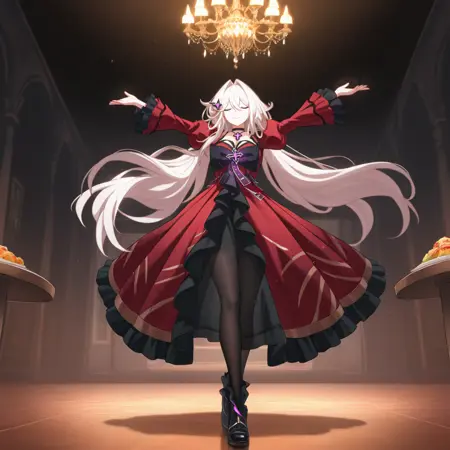 Thelema, Thel_Stg, long hair, purple eyes, white hair, hair intakes, long dress, frilled dress, black pantyhose, black dress, red dress, big bow, black bow, chest bow, purple cross, juliet sleeves, cleavage, frills, hair ornament, very long hair, see-through skirt, alternate black choker, red frilled sleeves,