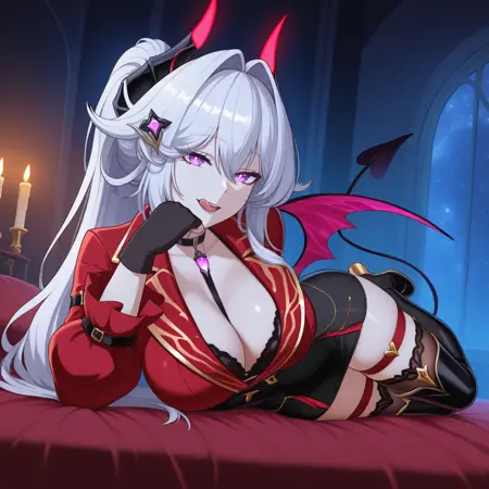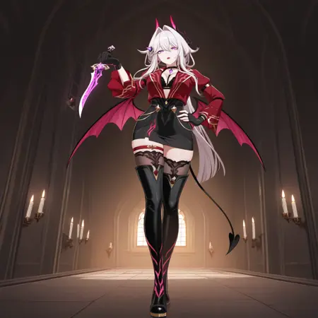 Thelema, Thel_Dvl, long hair, purple eyes, white hair, hair intakes, hair ornament, demon tail, low wings, demon horns, black bra, bra peek, high-waist skirt, black skirt, red jacket, collared jacket, black choker, red thigh strap, sleeve garter, ponytail, between breasts, choker pendant, thigh boots, black footwear, thighhighs under boots, brown thighhighs, pleated sleeves, gold trim, alt black gloves, mismatched gloves, single fingerless gloves,