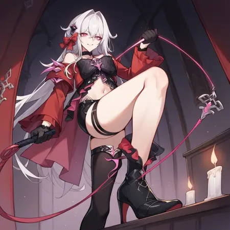 Thelema, Thel_Dvl, 長髪, 紫色の目, 白髪, 髪の巻き込み, 髪飾り, 悪魔の尾, 低い翼, 悪魔の角, 黒いブラ, ブラの見えている部分, 高めのウエストスカート, 黒いスカート, 赤いジャケット, リブ付きジャケット, 黒いチョーカー, 赤い太ももストラップ, 袖ガーター, ポニーテール, 胸の間, チョーカーペンダント, 太ももブーツ, 黒い靴, ブーツの下のタイツ, 茶色のタイツ, プリーツ袖, ゴールドの縁取り, 別の黒い手袋, 異なる手袋, 片方の指なし手袋,