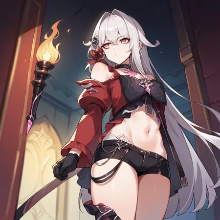 Thel_Def, マイクロショーツ, 黒いショーツ, 赤いジャケット, お腹, へそ, 大きなリボン, 黒いリボン, ジュエリー, 長袖, 赤い袖, 黒い手袋, 肩出し, 黒いチョーカー, 裸の肩, 黒いタイツ, 片側タイツ