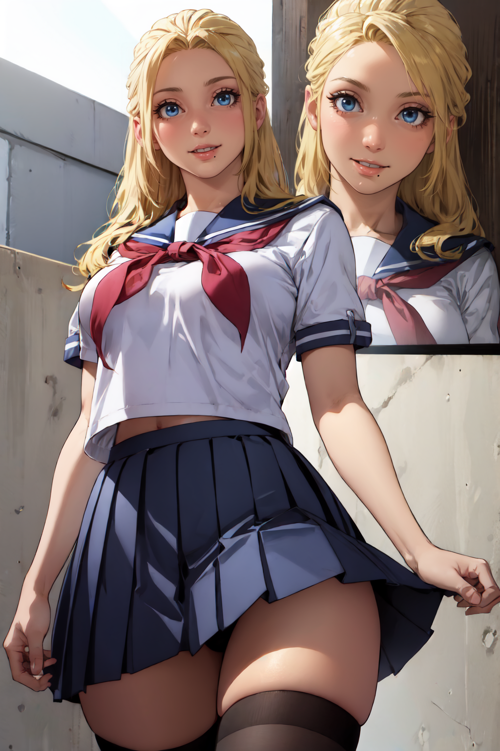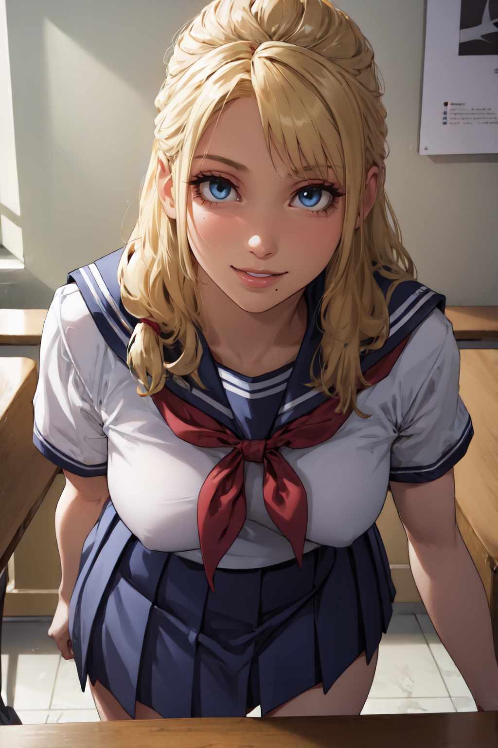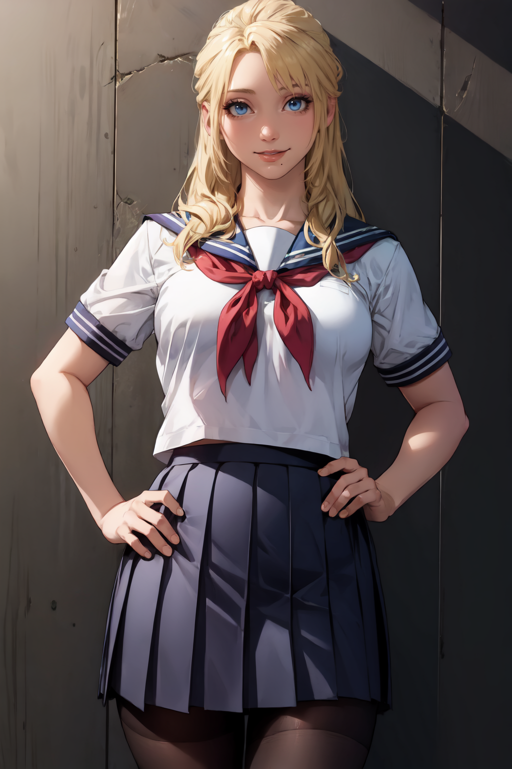 長い髪、口の下のほくろ、中くらいの胸、金髪、青い目