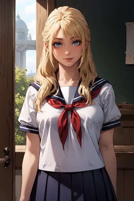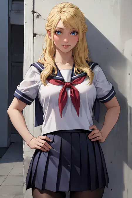 学校制服、セーラー服、青いセーラー collar、赤いネクタイ、白いシャツ、青いスカート、プリーツスカート、黒い靴下、靴