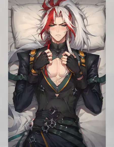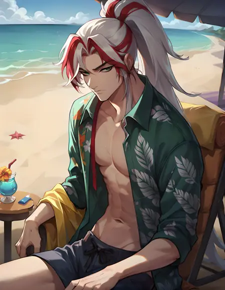 hs yone, solo, long hair, 1boy, jewelry, green eyes, ponytail, white hair, male focus, red hair, earrings, streaked hair, clothing cutout, cleavage cutout, tassel,