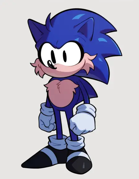 HogEXE, gloves, 1boy, animal ears, blue hair, tail, shoes, socks, white gloves, black footwear, black eyes, white socks, furry, furry male, body fur, white fur, animal nose, two-tone fur, blue fur, sonic the hedgehog, simplistic, cartoonish design, large oval black eyes, blue spikes on head, resembling Sonic, oversized white gloves and black shoes. no mouth