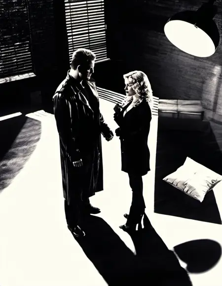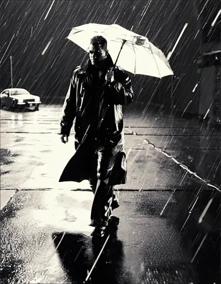 《Sin City》是2005年由罗伯特·罗德里格兹和弗兰克·米勒执导的新浪潮黑色电影,以其模仿图文小说风格的鲜明美术设计而著称。影片采用高对比度的黑白视觉效果,辅以偶尔的色彩点缀,营造出大胆而风格化的视觉效果,强化了其粗粝而富有氛围的叙事风格。
