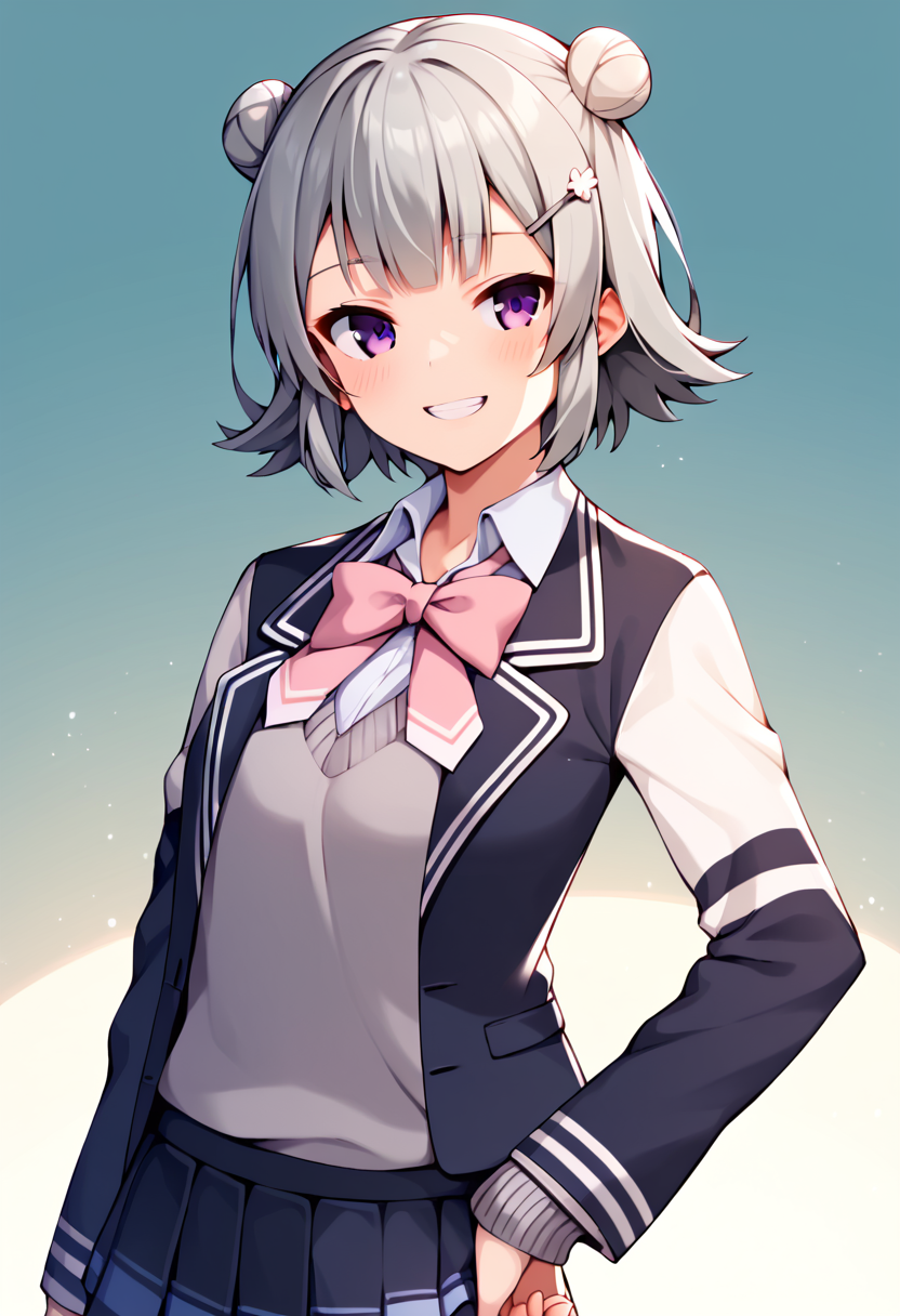 koharu rikka, grey hair, short hair, double bun, purple eyes,