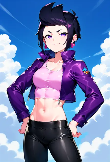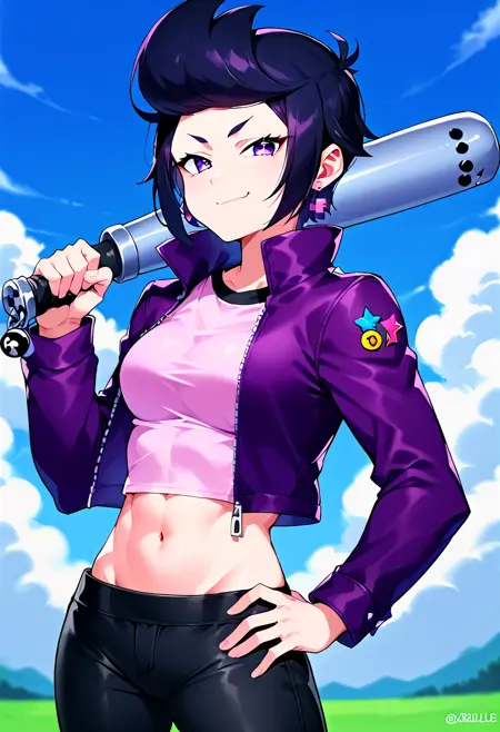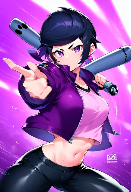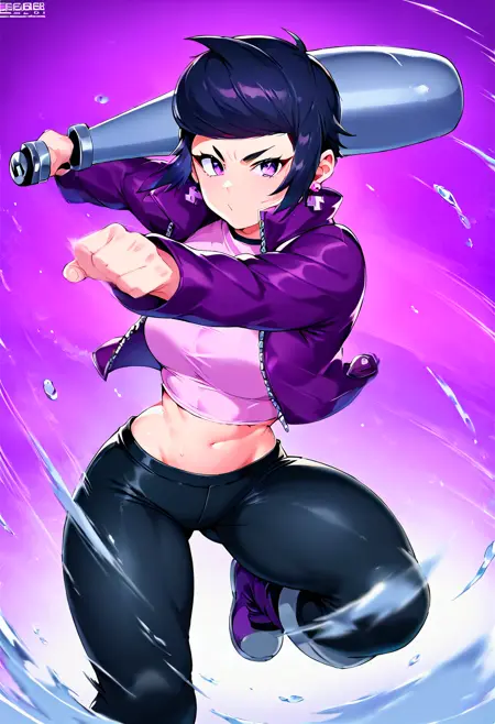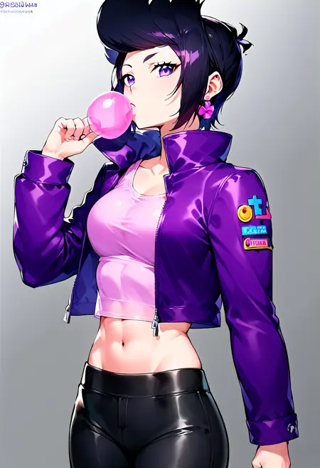 | 학습된 단어 | bibiBS, 1girl, solo, athletic body, purple eyes, black hair, short hair, cross earrings, purple jacket, crop jacket, crop tank top, pink top, midriff, black leggings복사됨! baseball bat, holding baseball bat, over shoulder복사됨! chewing gum, bubble gum, bubble blowing복사됨! |