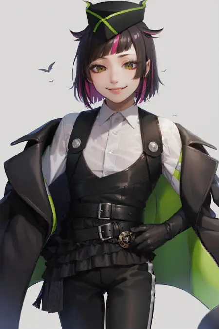 Default Outfit: hat, off shoulder, jacket, white shirt, black necktie, long sleeves, black pants, black gloves