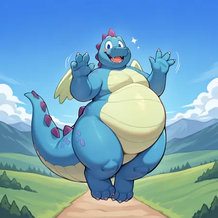 最佳正向输入:(ord, dragon, 蓝色皮肤, 浅绿色翅膀, 浅绿色腹部, 圆润, 胖, 毛茸茸, 紫色尖刺, 项链,)