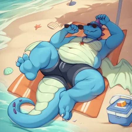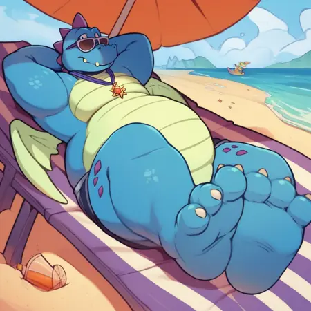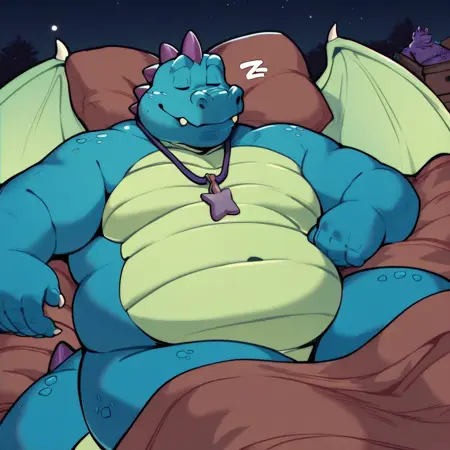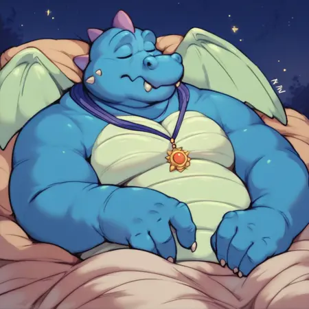 最適な正の入力: (ord, dragon, blue skin, light green wings, light green belly, chubby, fat, furry, purple spikes, necklace,)