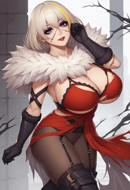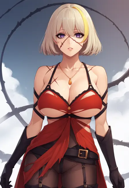 evaroux, 보라색 눈, 흰색 머리, 노란색 머리, 줄무늬 머리, 단발, 얼굴 흉터, 흉터, 큰 가슴, 목걸이, 빨간 드레스, 찢어진 옷, 가슴 노출, 팔 끈, 검은 장갑, 팔꿈치 장갑, 스타킹 끈, 스타킹 끈, 팬티스타킹, 허벅지 끈, 허벅지 부츠, 검은 부츠