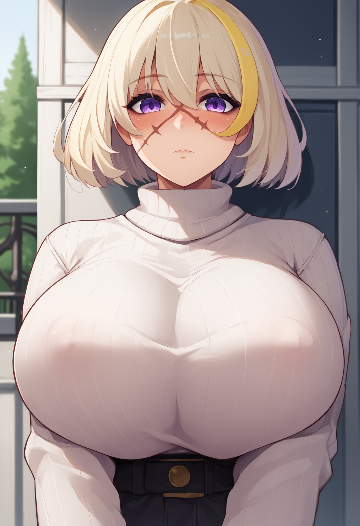 evaroux, 보라색 눈, 흰색 머리, 노란색 머리, 줄무늬 머리, 단발, 얼굴 흉터, 흉터, 큰 가슴, 아이섀도우, 메이크업