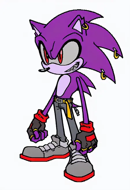 ColdsteelEXE, 1boy, purple fur, hedgehog, heather skin, cut left ear, red eyes, gray sclera, colored sclera, yellow belt, gray jeans, gray sneakers with red soles, gray fingerless gloves, red bracelets, few yellow rings in quills, sharp teeth,