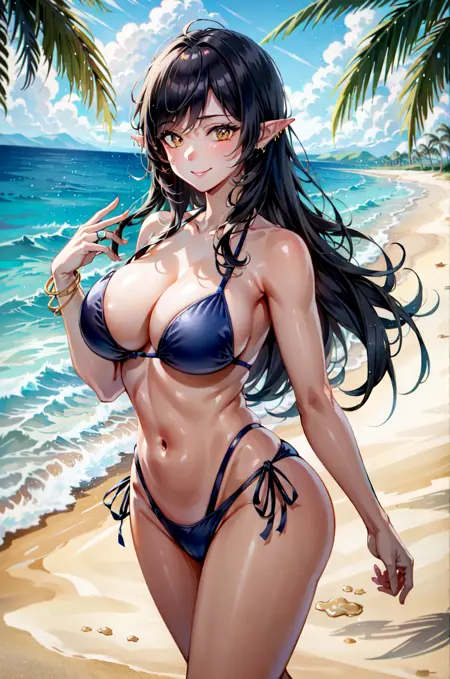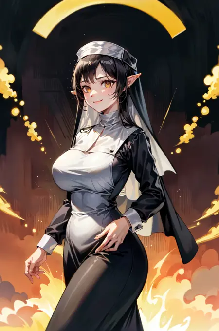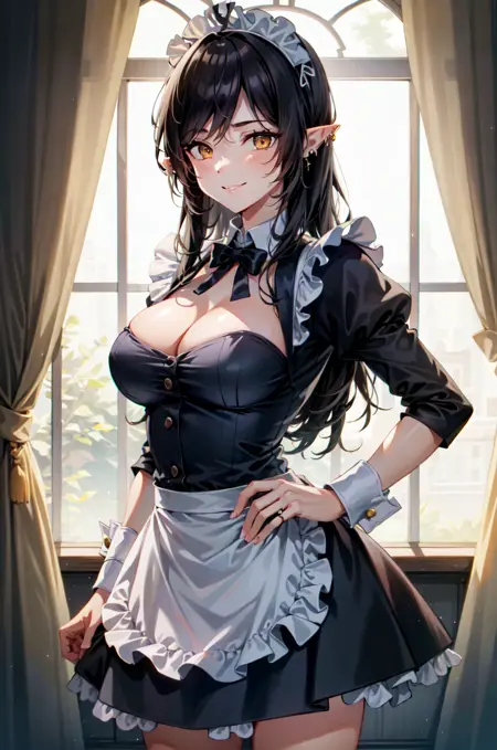 OlgaDiscordia, long hair, large breasts, black hair, orange eyes, pointy ears