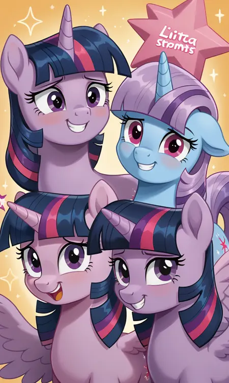 暮光闪闪、独角兽、天角兽、四足、紫色小马、可爱标志、星星可爱标志、淡紫色毛发、蓝色鬃毛和尾巴、尾巴和鬃毛上有粉紫色条纹、短而齐的刘海、淡紫色角、半短耳朵、粉红色六角星
