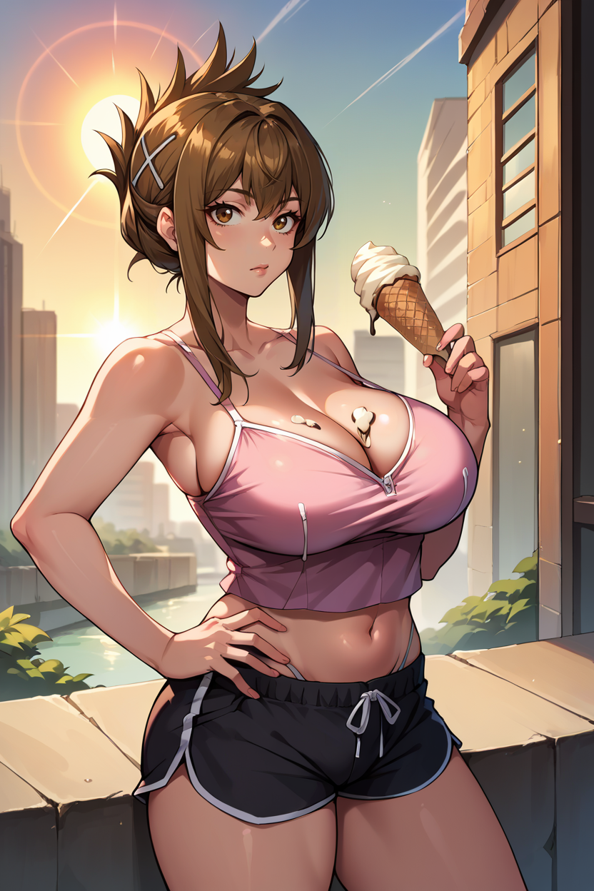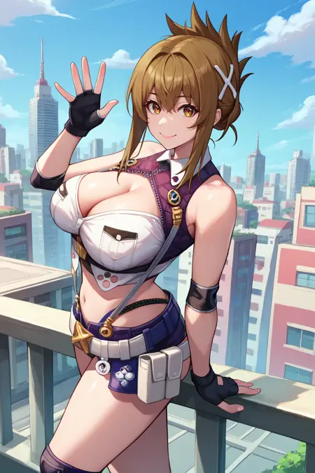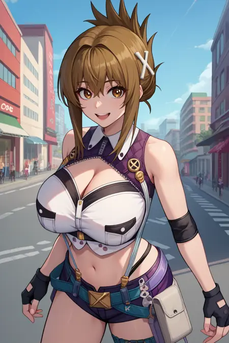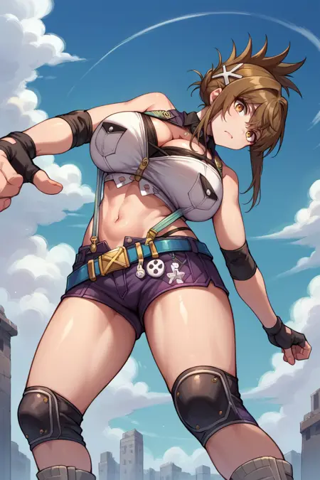 그녀의 전형적인 외모를 위해 "머리 장식, 검은 셔츠 칼라, 흰색 크롭 탑, 가슴, 소매 없음, 복부, 스트랩, 팔꿈치 패드, 벨트, 짧은 반바지, 손가락 없는 장갑, 무릎 패드, 부츠"를 추가하세요.