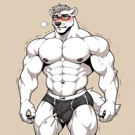 score_9, score_8_up, score_7_up, by kihu, male focus, 1boy, solo, male underwear, furry, bara, muscular, furry male, muscular male, ass, blush, thighs, thick thighs, tail, underwear, animal ears, jockstrap, underwear only, full body, dog ears, white male underwear, briefs, back, topless male, dog boy, collar, short hair, from behind, motion lines, dog tail