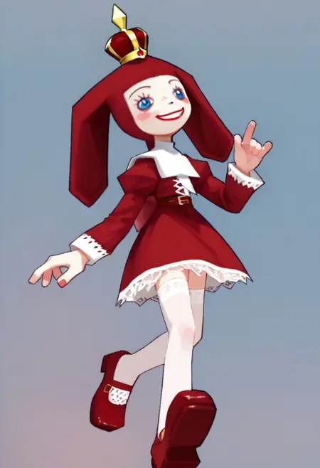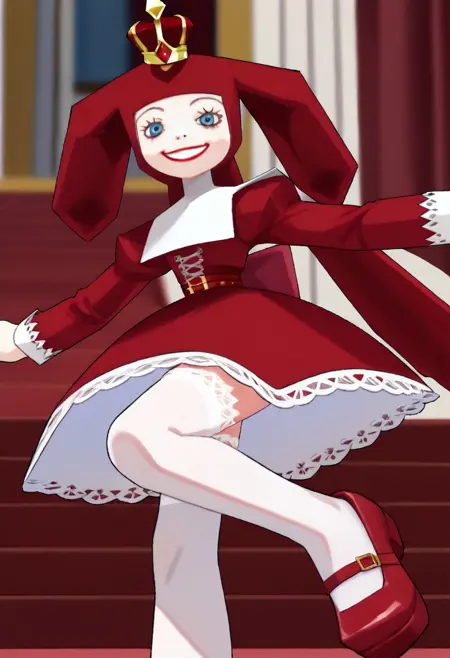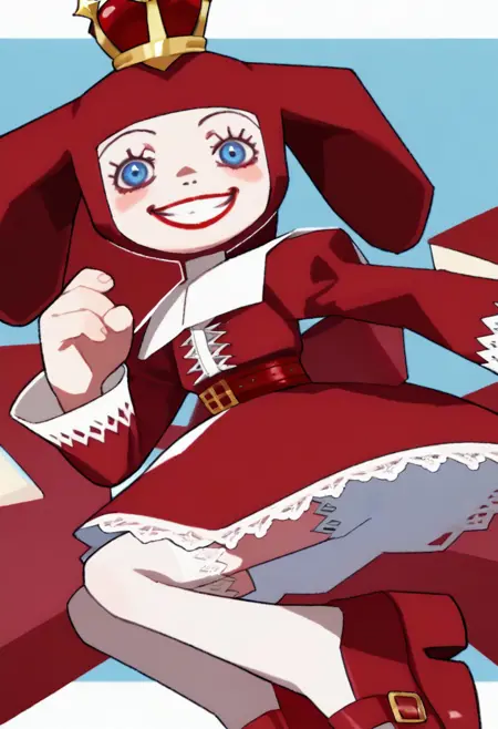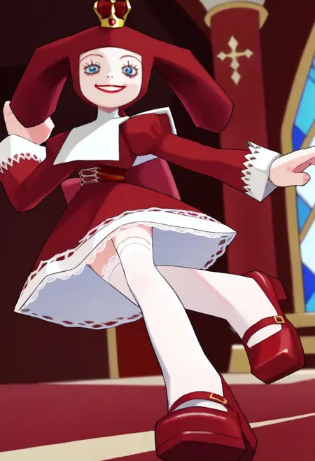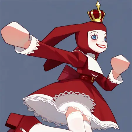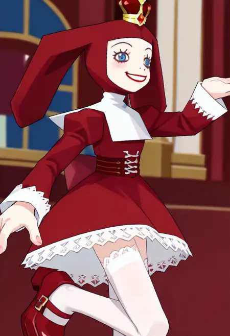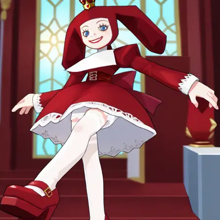 PriZuDDR, 1girl, red gold crown, red headdress, blue eyes, red lipstick