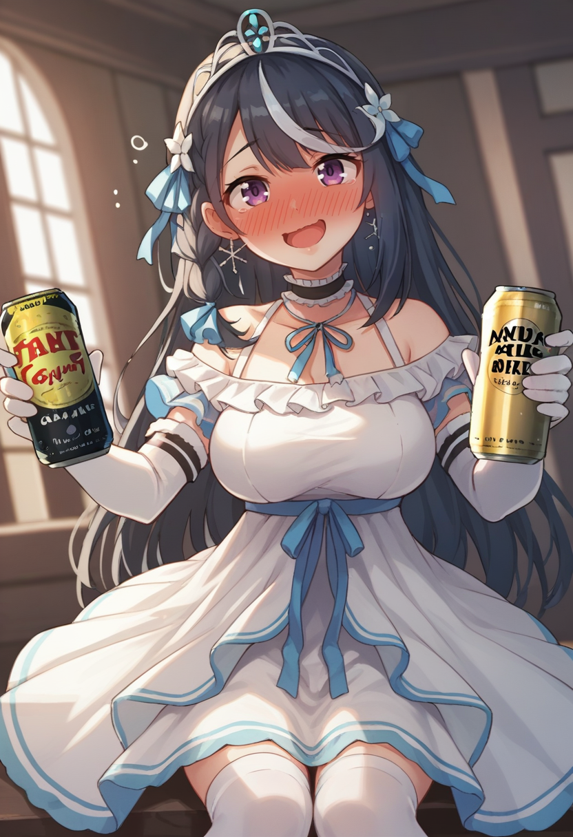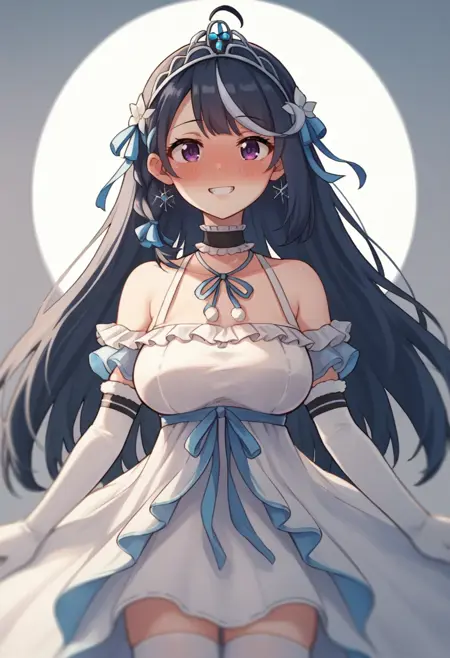 기본 옷차림: 드레스, 흰 드레스, 어깨 노출 드레스, 머리 장식, 팔꿈치 장갑, 흰 장갑, 프릴, 초커, 티아라, 리본, 귀걸이, 보석
