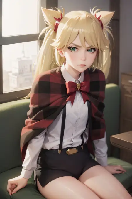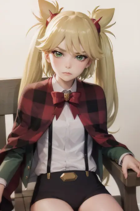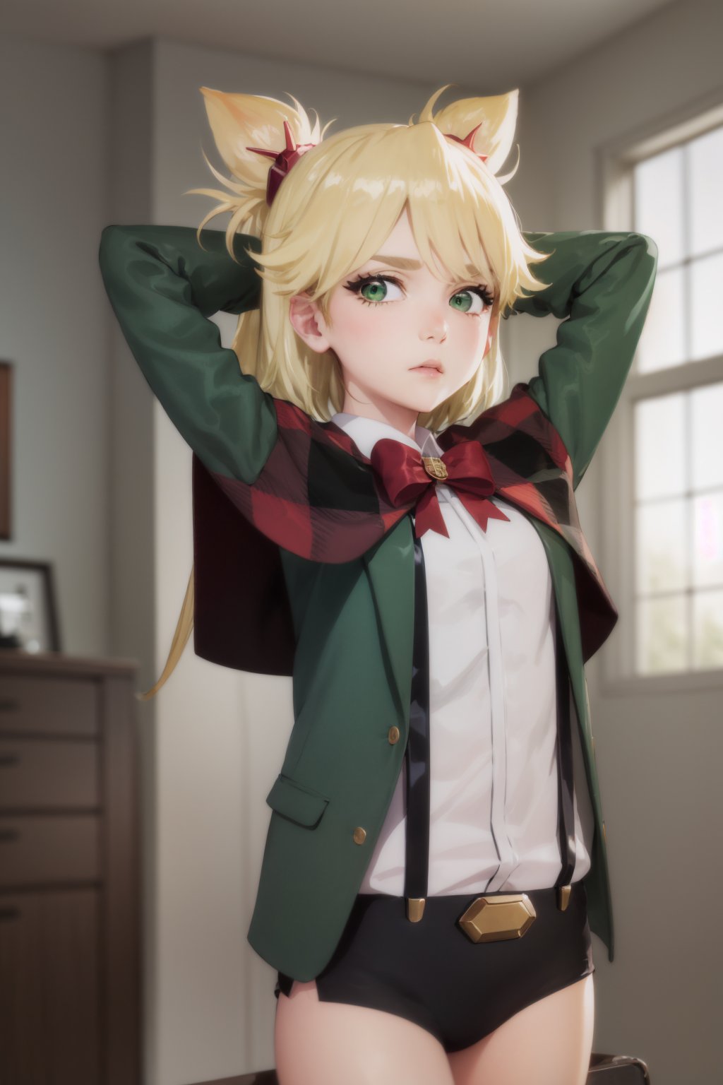 デフォルトの服装: 緑のジャケット、長袖、白いシャツ、赤いリボン、サスペンダー、ケープレット、黒のショートパンツ