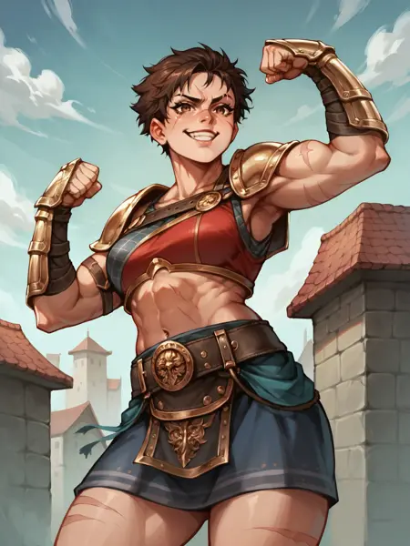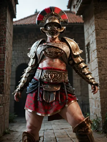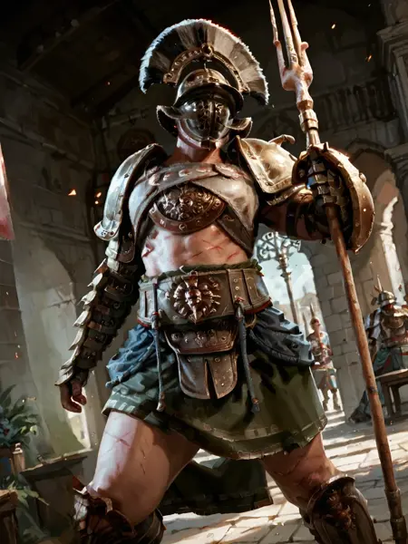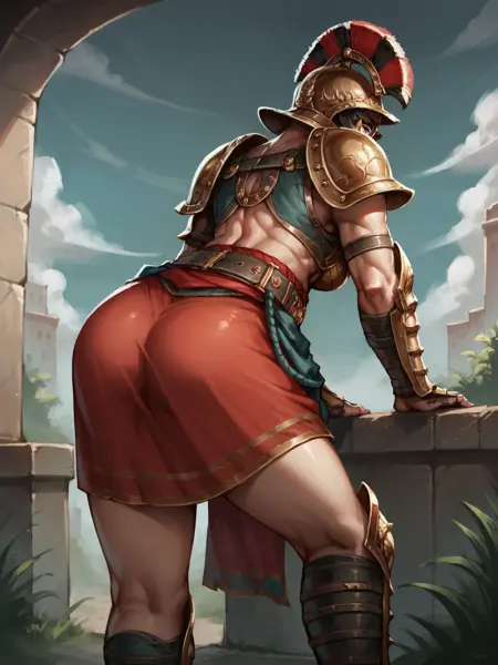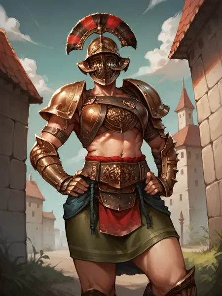 触发词: FemGladiator,盔甲,护肩,肩甲,腰带,手套,短裙,头盔。