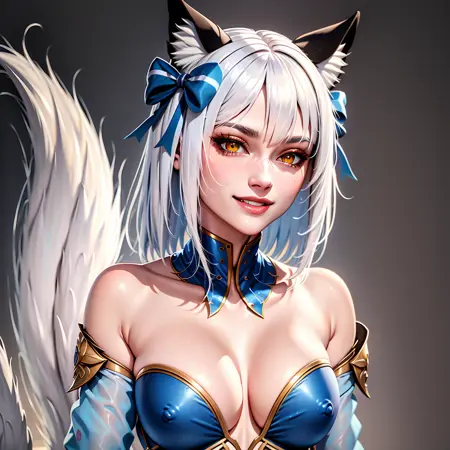 推奨される用語: "1girl, beautiful face, white hair, animal ear, tail, cleavage, smiling, blue hair bow, blue dress, art by LeahFX-2000-10000"