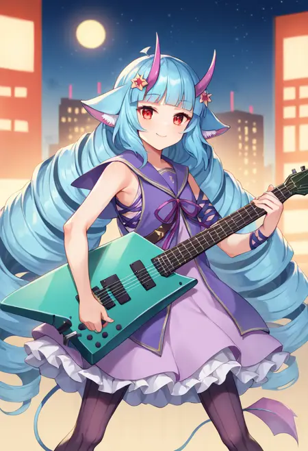 一緒にholding guitar, playing instrument, 等を挿入するとキャラに関係なくデルミンのギターを持ちます。色以外に再現出来てないので妥協点です。