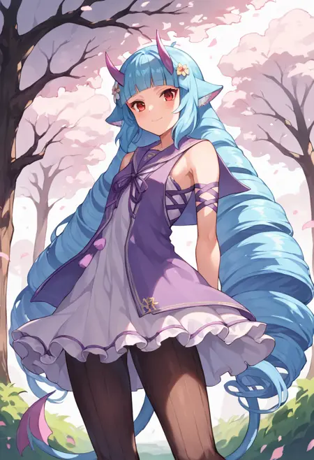 very long hair, drill hair, blue hair, twin_drills, blunt bangs, red eyes, horns, animal ears, hair ornament, tail,