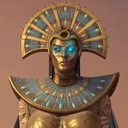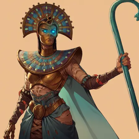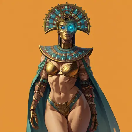I was unable to reproduce the half gold mask/ half zombie look from the concept art, so I'd definitely like to remake this LORA at some point. Currently you can either give her the full gold mask from her model (via the prompt gold mask) or you can go for a rejuvenated, de-mummified look (prompt for brown skin or a different skin type)
