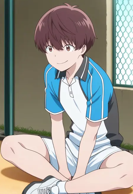 itsuki, 1boy, male focus, brown hair, shorts, brown eyes, sportswear, shoes, socks, short sleeves, white footwear, white socks, short hair, tennis uniform, white shirt, blue shirt, raglan sleeves,