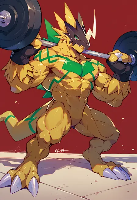 (不知为何这个模型有点挑剔。它总想给高兽穿上像《街头霸王》里隆那样的腰带和裤子。可通过负面提示或多次生成来修正。不过说实话,它有时也会生成非常酷且贴合主题的装扮,所以我并不完全不满)