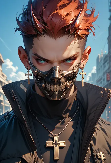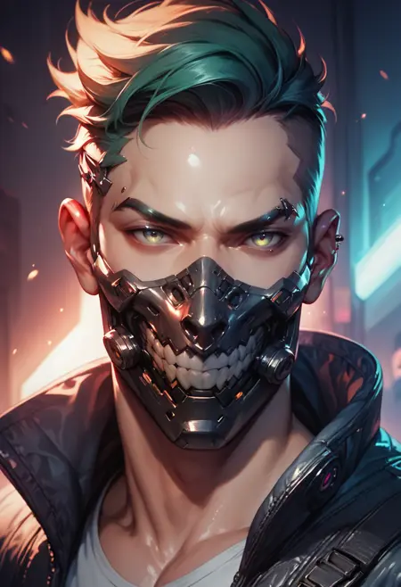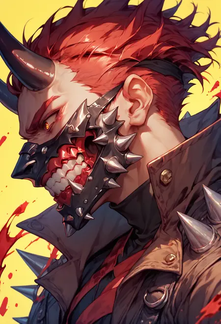 使用するタグ: マウスマスク、マスク、スカルマスク(スカルにしたい場合)、サイバーパンク、呼吸器、ガスマスク、角、鬼、スパイク、メタリック、フルフェイスマスク、歯、ロボット、鋭い歯(「ファング/鋭い歯」と「歯」を同時に使うと奇妙なことが起こることがあるので注意!たまにLoRAが両方を同時に追加しようとするみたいで、笑 :p)